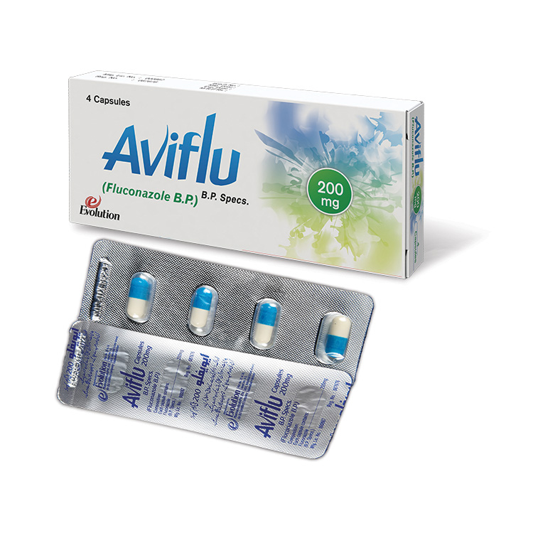 Overview: Aviflu 200mg is a high-quality antifungal medication manufactured by Evolution Pharmaceuticals (Pvt.) Ltd. Each pack contains 4 carefully formulated capsules, each providing 200mg of Fluconazole. The product strictly meets B.P. specifications, ensuring maximum quality, efficacy, and reliability for patients requiring higher dosage management.