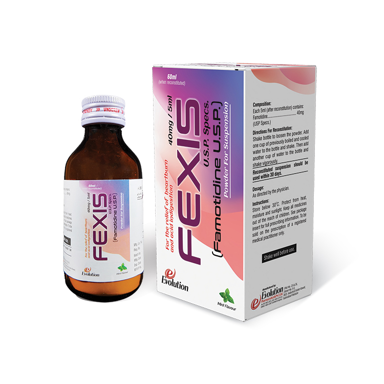 Overview: FEXIS is a dependable gastrointestinal medication manufactured by Evolution Pharmaceuticals (Pvt.) Ltd. It contains Famotidine in powder form for reconstitution into a 60ml oral suspension. Meeting United States Pharmacopeia (U.S.P.) standards, it provides fast-acting relief from symptoms of acidity and heartburn with a cooling mint taste.