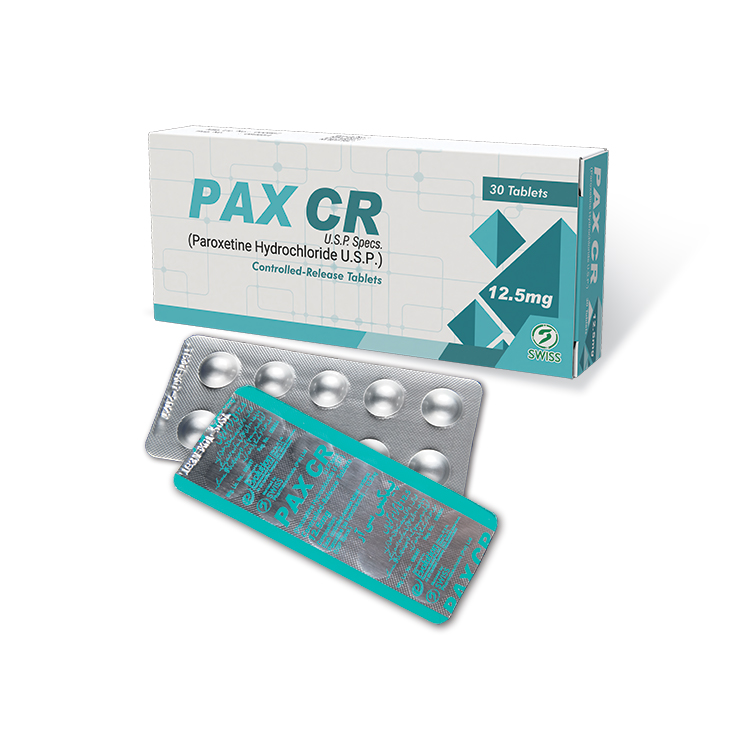 PAX CR 12.5mg (30 Controlled-Release Tablets) features Paroxetine Hydrochloride formulated to strict U.S.P. specifications. Manufactured by Evolution Pharmaceuticals and marketed by SWISS Pharmaceuticals, this prescription medication provides a dependable standard of care exactly as directed by your physician.