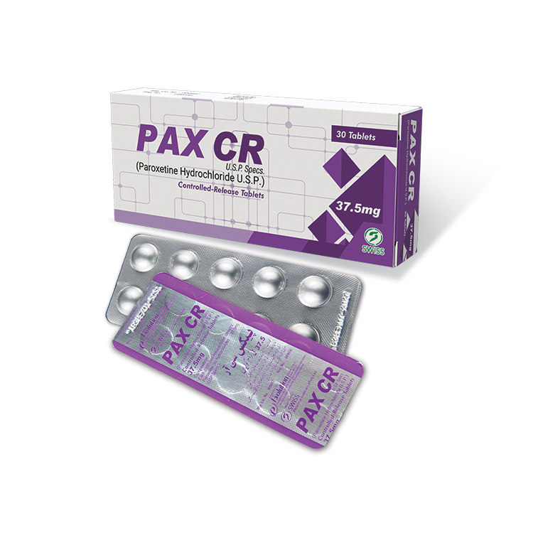 Overview: PAX CR 37.5mg is a high-quality medication manufactured by Evolution Pharmaceuticals (Pvt.) Ltd and proudly marketed by SWISS Pharmaceuticals (Pvt) Ltd. Each pack contains 30 carefully formulated controlled-release tablets containing 37.5mg of Paroxetine. The product strictly meets U.S.P. specifications, specifically noting that it meets USP Dissolution Test 2, ensuring maximum quality, efficacy, and reliability for patients requiring higher dosage management.